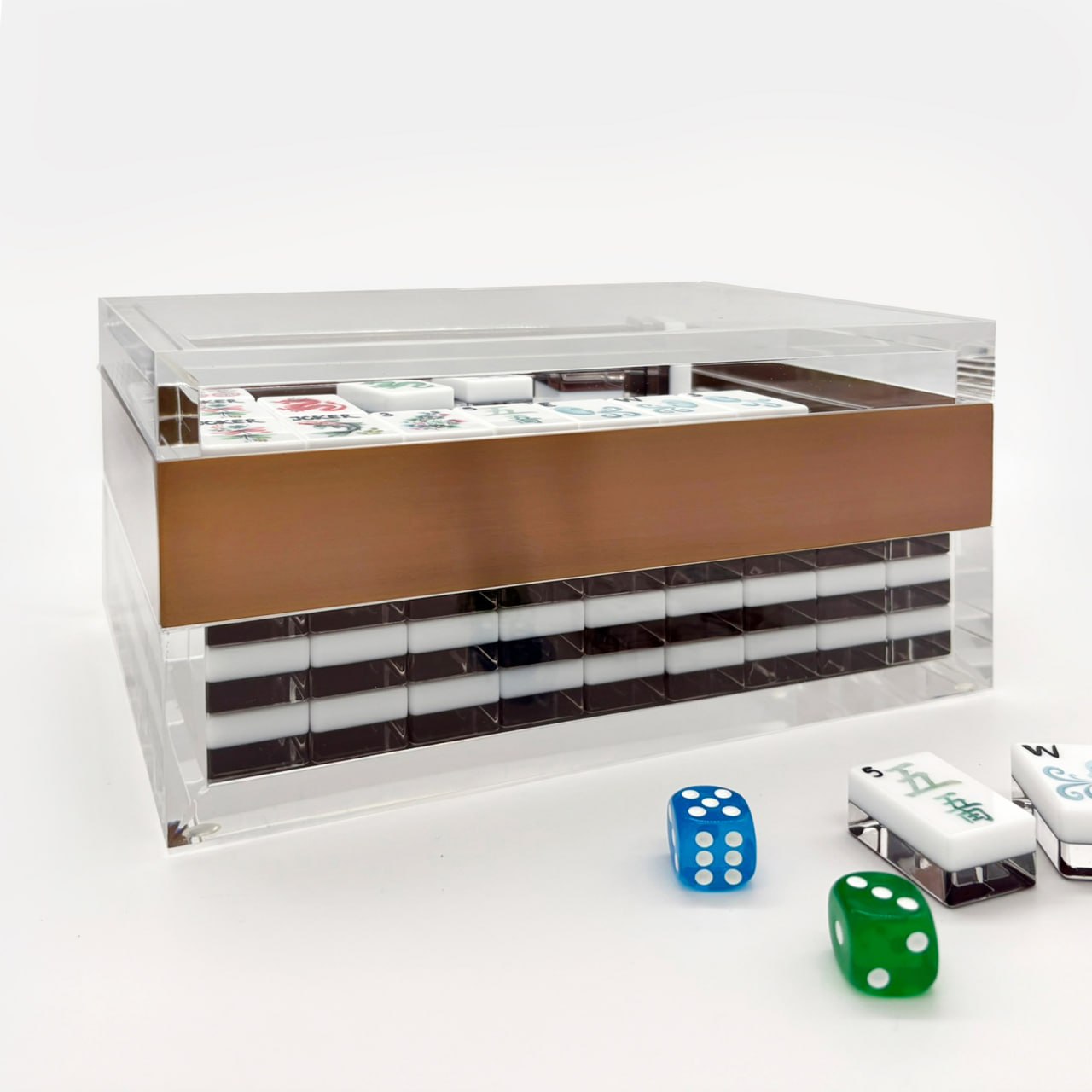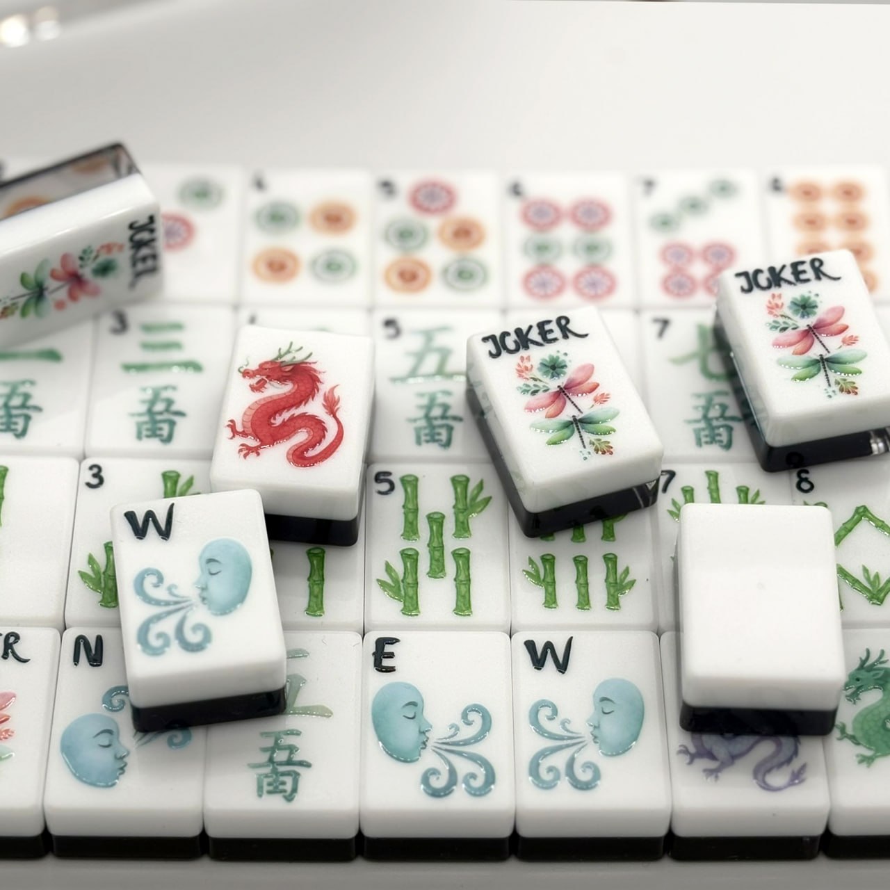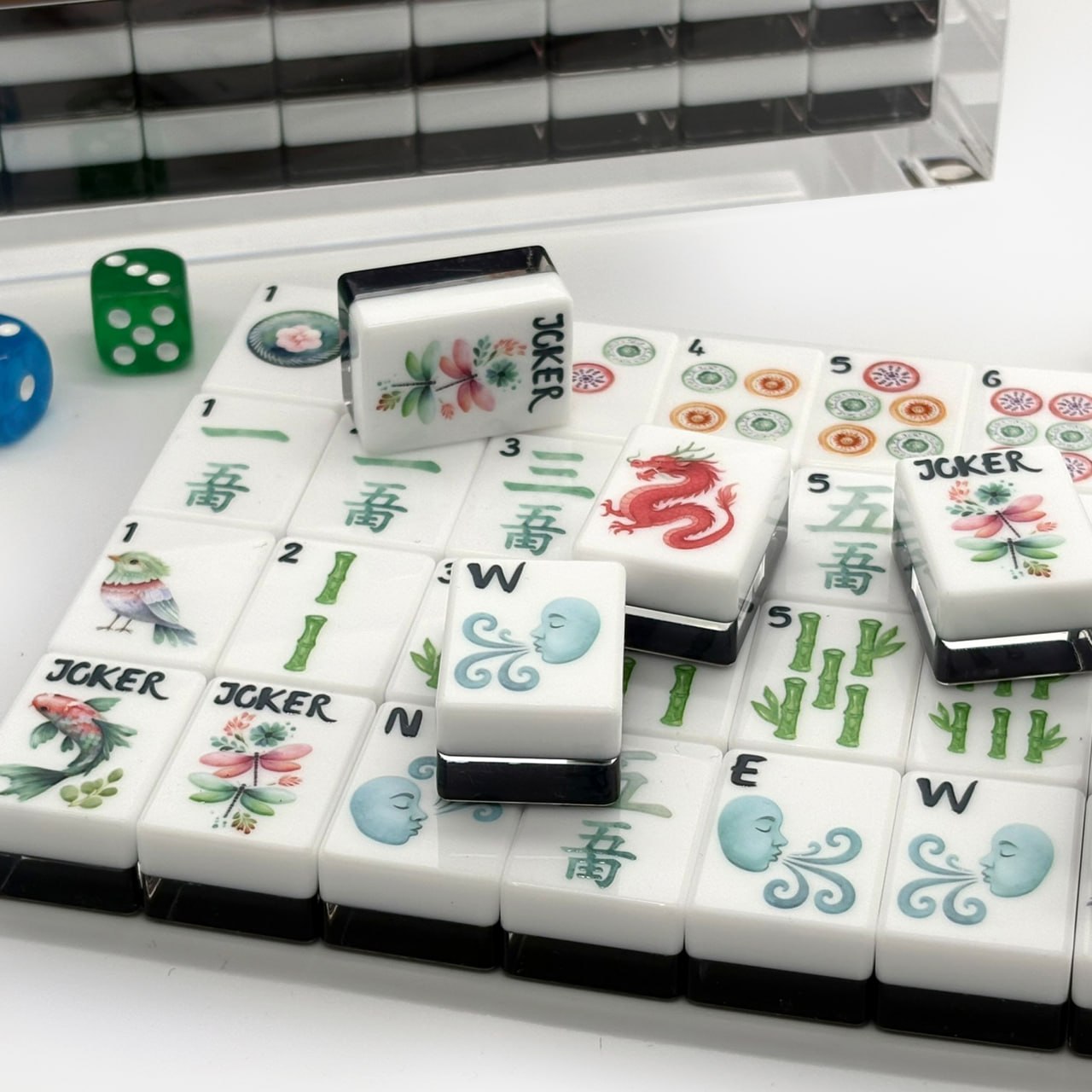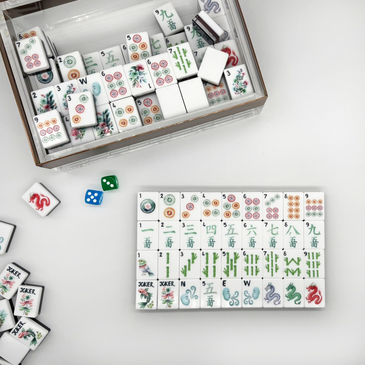 A functional art piece, this mahjong set features multicolored watercolor birds and dragons that add movement and mythology to any space. It comes housed in a crystal-clear acrylic storage box, making it as striking on display as it is in play—perfect for styled shelves, coffee tables, and game rooms.